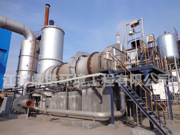 采用重油、廢溶劑為加熱介質(zhì)。將在流化造粒塔生成的含有機(jī)物的混合污鹽加入回轉(zhuǎn)焙燒爐內(nèi)焙燒。在高溫下污鹽中的有機(jī)物氣化熱解。焙燒后的無(wú)機(jī)鹽外送綜合利用或填埋。焙燒產(chǎn)生的煙氣經(jīng)焚燒爐二次焚燒,將煙氣中有機(jī)物完全氧化成CO2、H2O、HCl、S
